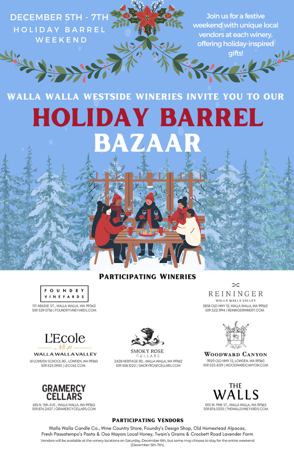 Holiday Gifting Ideas: Enjoy holiday-inspired gifts from these participating vendors: Crockett Road Lavender Farm at Woodward Canyon Winery, Walla Walla Candle Co., Wine Country Store, Foundrey's Design Shop, Old Homestead Alpacas, Fresh Passatempo's pasta & Osa Mayors Local Honey, and Twain's Grains.